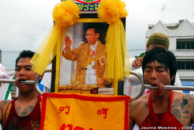 Dos xicots transporten una fotografia emmarcada del rei. La imatge és al centre d’una barra metàl·lica. Claven ambdós extrems de la barra a les respectives galtes dels nois. Ni un crit de dolor. Cap gemec. La fotografia del monarca estimat, ara mateix seriosament malalt en un hospital de Bangkok, sembla que els reconforta. Caminaran descalços tres hores pels carrers de la ciutat amb el retrat del rei sostingut per les seves galtes. Cap llast, sinó joia. Emoció dels veïns. S’agenollen i es postren. Ulls plorosos, barres d’encens als dits.