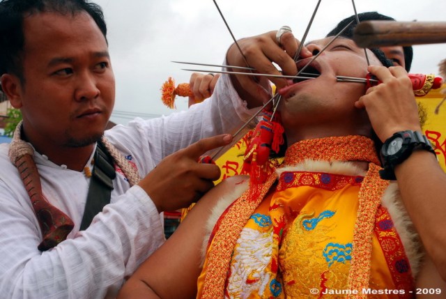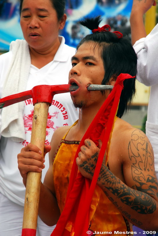 A Nakhon Ratchasima molts ciutadans surten al carrer per exterioritzar la seva devoció als déus del panteó xinès i als esperits que governen les seves vides. Van arribant a la plaça principal sota el retruny de timbals. Damunt unes plataformes arrossegades per camions s’alcen imatges daurades. Déus conciliadors, deesses benefactores. Als palanquins que porten homes vestits amb túniques seuen ídols d’espesses barbes. Davant les imatges hi ha clavats un rengle de punxons. El mànec de cada punxó és la fesomia d’un dimoni. Cares sangonoses, ulls irats. Molts homes duen espases embeinades, sabres esmolats creuats al pit. Fuets penjats al coll. N’hi ha que porten pendons; d’altres, presenten safates d’ofrenes. A la plaça s’han congregat uns dos-cents homes vestits d’un blanc impecable.