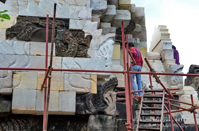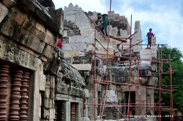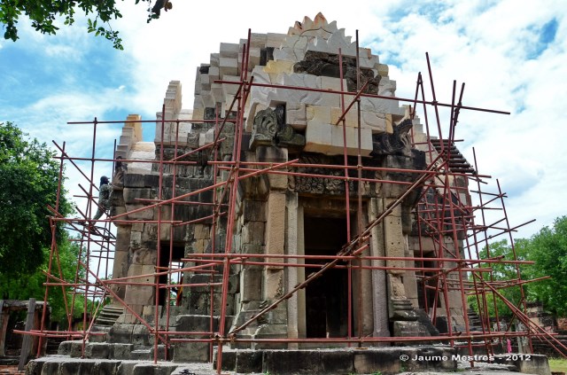 La reconstrucció d’aquestes joies arquitectòniques, contemporànies al nostre Romànic, és un debat obert amb opinions diverses i sovint contraposades. Hi ha el corrent dels que no tocarien una sola pedra i els que ho refarien completament. Entre les dues postures extremes acostuma a imposar-se la moderació. D’acord amb la distribució sobre el terreny de les peces arqueològiques, de vegades ben disperses, i als coneixements tècnics sobre aquests tipus de construccions, els entesos esbossen el suposat aspecte que presentaven els monuments abans d’enrunar-se. En una restauració ben feta resta poc espai per a la imaginació o la fantasia. Malauradament no sempre s’imposen els criteris científics a l’hora de determinar la reconstrucció d’aquests temples. Els experts tailandesos deuen rebre pressions diverses a l’hora d’afrontar la restauració d’un monument. Sovint es deixen emportar per la divagació fantàstica. D’aquí que algunes seccions de temples Khmer reconstruïts en territori tailandès semblin més construccions de parc temàtic que reproduccions fiables. En general, els tais valoren més la coloraina escenogràfica que la substància. El concepte de fer bonic gairebé sempre s’imposa al rigor científic. Obres majors com el Prasat Hin Phanom Rung -la joia de la corona dels temples Khmers tailandesos restaurats- o el santuari de Phimai, a uns 50 quilòmetres al nord-est del temple de les imatges, són uns bons exemples.