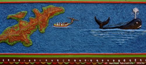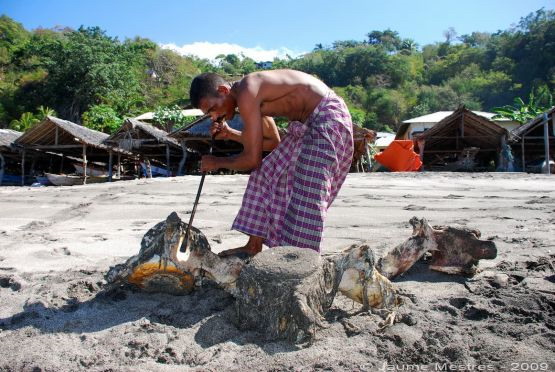 Els dies que sóc a Lamalera passo la major part del temps a la platja. La platja és l’escenari on es desenvolupa la vida comunal. Mentre la canalla juga, els caçadors forgen arpons en brasers alimentats per manxes de bambú, reparen naus, fumen tabac embolicat amb fines fulles de lontar, fan capcinades, mengen i beuen vi de palmera. Conversen i canten al peu de les embarcacions. La platja de sorra negra, a l’ombra dels rafals, és l’ampli espai de convivència mentre el crit “baleo, baleo!” no enviï els homes a la mar. Baleo és la corrupció del mot portuguès baleia, per balena. Quan qui albira un cetaci crida “baleo, baleo!”, la platja de Lamalera surt de l’ensonyament i esclata. “Baleo…!” va de boca en boca, rebota com un eco a l’espadat, es multiplica per mil i es projecta en cada racó del poble. En un instant, les tripulacions es congreguen per arrossegar les tena al rompent de les onades. Mentre les empenyen, els homes entonen: “Hilabe, hilabe, hela, hela, hilabe, hela, hela…”. És dur arrossegar voluminoses naus que superen la tona de pes per damunt la sorra, ni que alguns troncs posats sota les quilles amoroseixin l’esforç. El costum imposa que abans d’embarcar-se les tripulacions orinin a la platja. Des del moment d’abordar les barques fins el retorn, la tradició tampoc permet menjar ni beure.