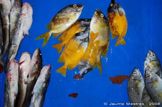 Al port hi ha alguns tricicles que circulen lents amb l’esperança de trobar clients. N’agafo un. Demano al conductor que em porti a l’oficina de la companyia aèria Merpati. A les quatre de la tarda hi ha anunciat un vol directe a Bali. El problema és que a hores d’ara l’avió ja és ple. Conversa, conversa i més conversa. Aquesta és la clau per obtenir el què cal. Conversa cordial, és clar. I simpatia. Aplicant aquest mètode tan simple segur que si hi ha una escletxa, per mínima que sigui, aconseguim passar. Doncs sí, ja tinc bitllet. També m’han permès deixar la motxilla i les bosses darrere el taulell fins que no sigui l’hora de dirigir-me a l’aeroport. I encara més: la noia que m’atén m’ofereix portar-m’hi de franc amb el vehicle de la companyia. Gràcies i més gràcies, somriures gens fingits i tots contents. Encara falten unes quantes hores per volar. Serà fàcil omplir el temps havent-hi el mercat del peix. Aquest és un dels millors exercicis que es poden fer a Maumere. La diversitat de peixos a la venda és espectacular. Mil colors a les parades, mil llampants colors acabats de robar al mar. Tortugues marines en cubells, ous gelatinosos dels quelonis apilats sobre plàstics virolats. Petits i grans taurons. Crustacis. Peixos voladors, pops, petxines, calamars, rajades, tonyines i mantes sangonoses acabades d’esquarterar.