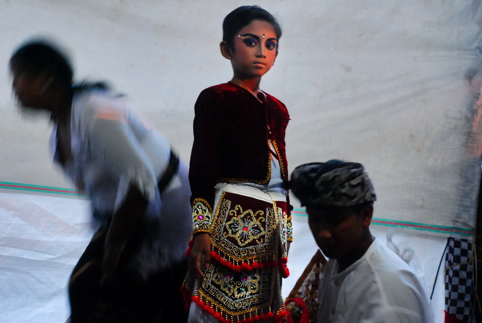 Dues vegades l’any al temple ubicat al nord d’un vilatge balinès, alçat entre un verdissar de camps d’arròs i arran d’una gorja profunda per on discorre un rierol, s’hi celebra una cerimònia hinduista anomenada Mecaru Godel o Butayadnya. Els rituals religiosos s’allarguen uns quants dies. Durant les hores diürnes les dones del poble omplen de flors i paneres de menges els altars i pavellons del temple. Són ofrenes pels ídols que els presideixen. Després els honoren pregant assegudes sobre el terra de lloses. Però és a les nits quan l’activitat al santuari arriba a l’apogeu. Famílies senceres ocupen el recinte del temple per trobar-se amb convilatans i els esperits dels seus difunts. Amb la pregària s’acosten a les ànimes i a través de la meditació profunda poden comunicar-s’hi. Els bramans són el pont entre el món visible i l’intangible. Salmòdies atàviques, dringar de campanetes, pètals d’oloroses flors i aigua beneïda configuren el marc per accedir a l’univers reconfortant de l’esperit. Recolliment general i benediccions massives transporten els fidels a una dimensió més enllà de la física, immersos en un silenci absolut només trencat per l’esporàdic tritlleig de la petita campana que branda el gran sacerdot o pedanda. Sota pavellons oberts als quatre vents sona harmònicament el metall de gongs i platerets, amorosit per timbals i flautes. Són un parell d’orquestres de gamelan tocades pels homes del poble. Els creients que esperen torn per accedir al més sagrat del santuari amb la intenció de purificar-se, i els que ja ho han fet, s’estan en un àmbit més distès destinat a la contemplació de danses de profunda significança religiosa. És l’hora del Calonarang. El moment de les representacions dramàtiques que rememoren l’origen de Bali, una amalgama de llegendes i màgia expressada bàsicament a través de la dansa. El ball que veiem al vídeo es diu Topeng Jauk Keras, que podríem traduir per “dansa amb màscara de color vermell”. Balla un nen del vilatge de a penes 10 anys. L’enregistrament és fet des d’un angle inusual, concretament des del costat oposat als músics i espectadors, a l’esquena del ballarí. Val la pena observar el vívid ambient a l’entorn del noi que dansa amb gran entusiasme.