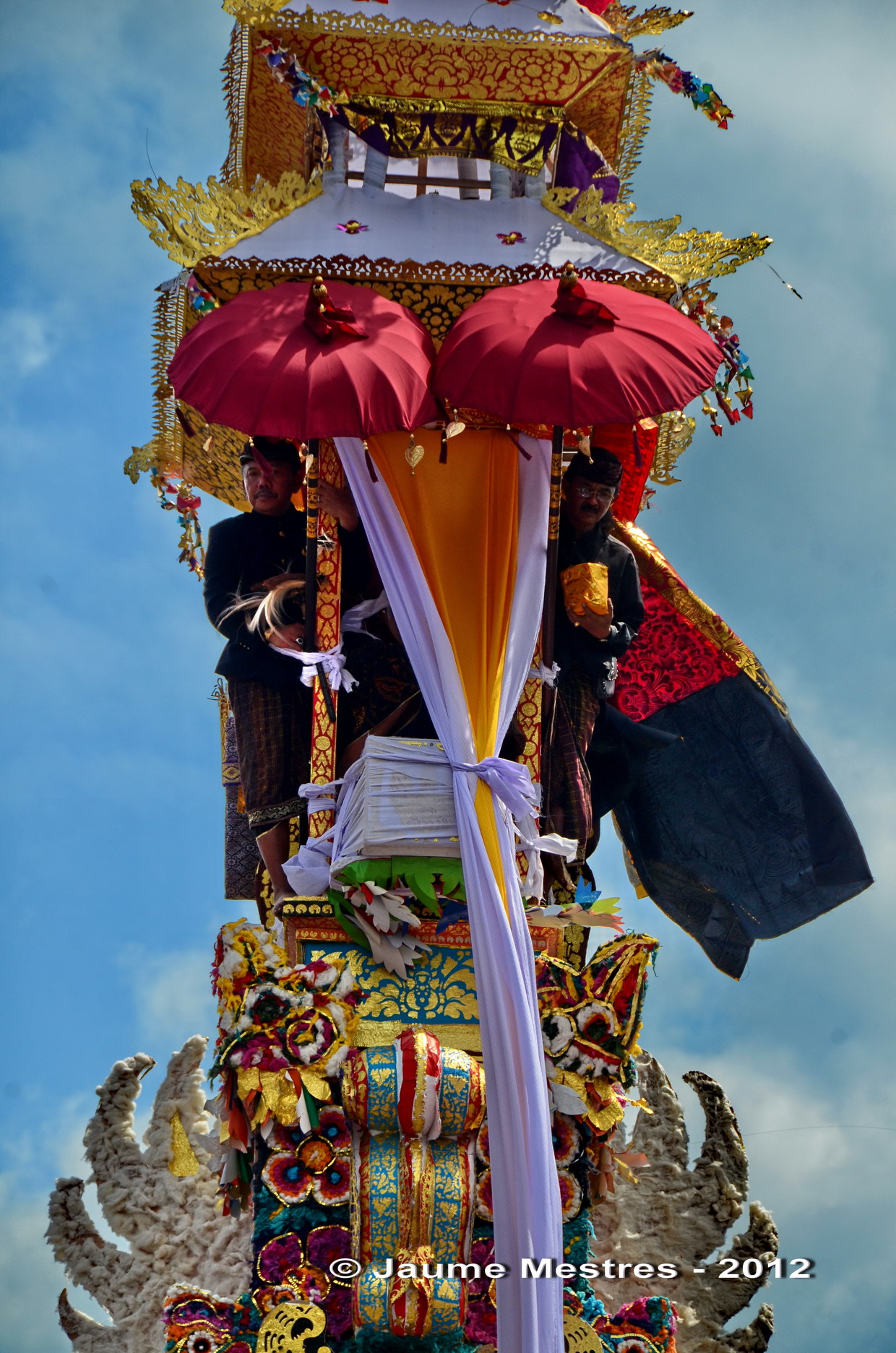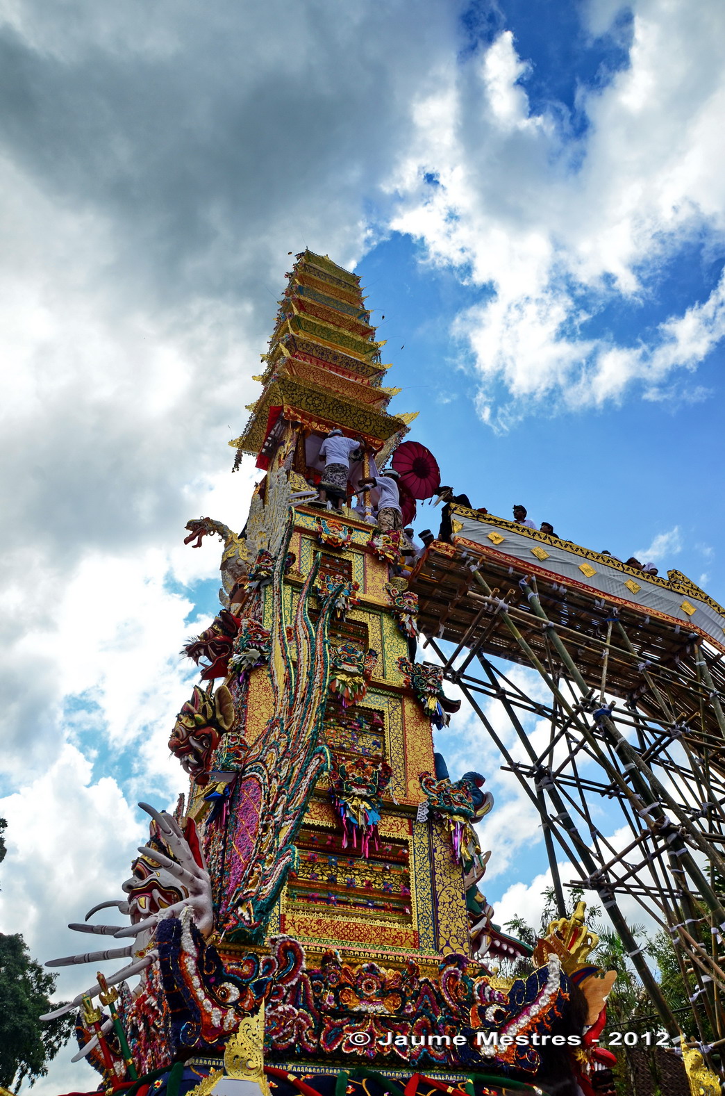 El 28 de juliol s’ha celebrat la cremació del dignatari de la família reial d’Ubud Pak Cokorda Putra Dharma Yudha. Ha estat espectacular i multitudinària com s’esperava. A la imatge veiem la torre o bade (en balinès) amb el cadàver a l’interior. Custodien el fèretre dos membres de la família reial. La torre reposa sobre una plataforma de troncs de bambú. Una multitud la tragina carregada a les espatlles, des del palau d’Ubud al cementiri de Tebesaya, uns 850 metres en direcció a llevant. Ubud. Bali.