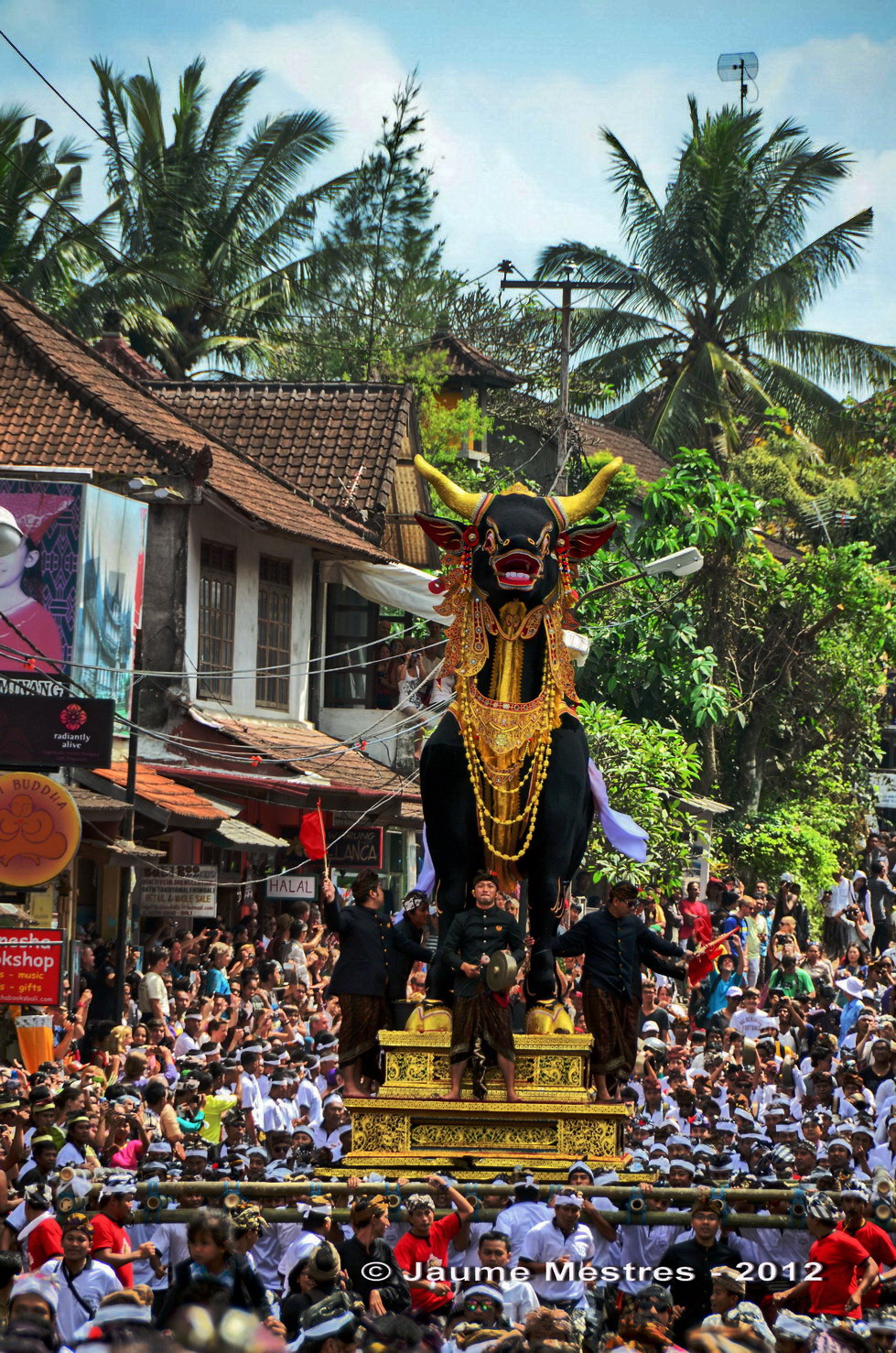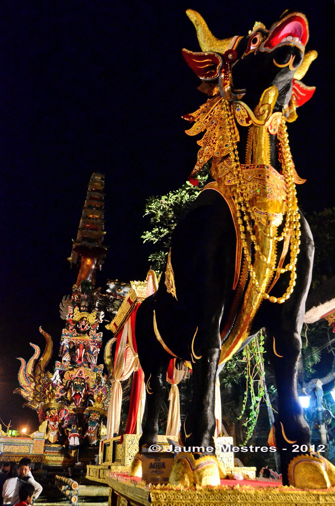 A la nit del mateix dia de la cremació, estava fotografiant les restes del toro que a primera hora de la tarda va ser incinerat amb el cadàver de l’àvia Txokorda al ventre. Davant l’esquelet del toro hi havia un altar elevat fet amb bambús on un parell de sacerdots practicaven els rituals adients. La totalitat de la família Txokorda hi era present. Unes dones entonaven cants i planys en kawi, la llengua ritual balinesa. Una orquestra de gamelan acompanyava la cerimònia. Amb aquestes que se m’acosten un parell de francesos. Dos joves, noi i noia, amb pinta de motxillers. Vestien roba de la que podríem dir-ne ètnica: teles vaporoses, esfilagarsades i probablement no gaire netes. El noi va demanar-me sense que li tremolés la veu quan se celebraria la cremació. M’ho preguntava sota el toro encara fumejant, les cendres ben calentes, immersos tots plegats en una intensa sentor de socarrim.
