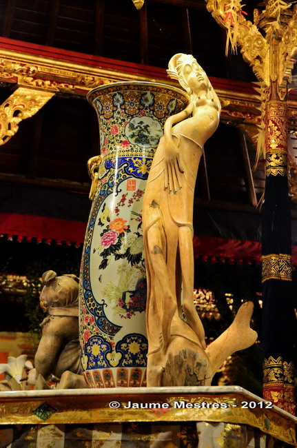Detall de la torre (en balinès, bade) on avui posaran el cadàver del difunt per portar-lo a incinerar. Al cementiri baixaran el cadàver de la torre i el dipositaran dins la panxa del toro (lembuh). Un cop a dins l’incineraran. Amb la cremació es pretén enviar l’ànima del finat al cel a cavall del toro, transport del déu hindú Xiva. Exterior del palau d’Ubud. Bali. Fotografia feta ahir a la nit. Nikon D7000. Posició manual. 6400 ISO. Sense flaix ni trípode.