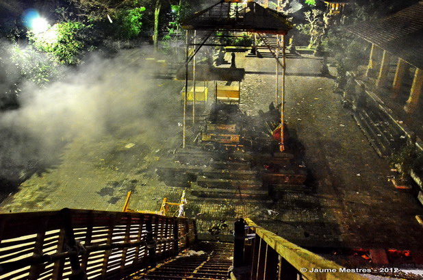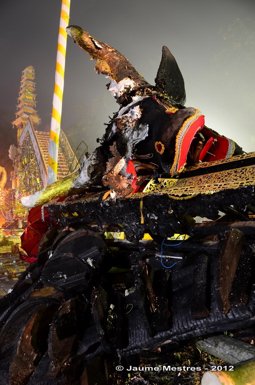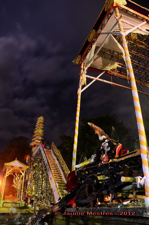 Quan l’escenari resta solitari començo a fer les fotografies que acompanyen aquest text. Em moc en un àmbit realment fantasmagòric. Molt poca llum, xerric d’insectes i l’udol d’algun mussol. Raudes ratpenats silents, més d’un aleteig arran d’orella. Un foc sobre els clots del cementiri, a prop de la pira funerària, escampa fum i sentors agres. Hi cremen trossos de fustes, canyes, umbrel·les i decoracions daurades. Dels espectecs dels bambús cremant-se en dic rots de fantasmes. Una colla de gossos s’acosta a la foguera al moment que començo a escalar la inclinadíssima plataforma que ha servit per baixar el cadàver de la torre mortuòria fins la pira. És una estructura feta enterament de bambú que s’alça 30 metres del sòl. Del cim estant observo un àmbit desolat, com si hagués estat arranat en el frenesí d’una batalla. Els gossos, encarats al foc, borden excitats. Els balinesos saben que els animals desafien les criatures que dansen entre flames. Són ànimes penades ancorades als cossos enterrats.