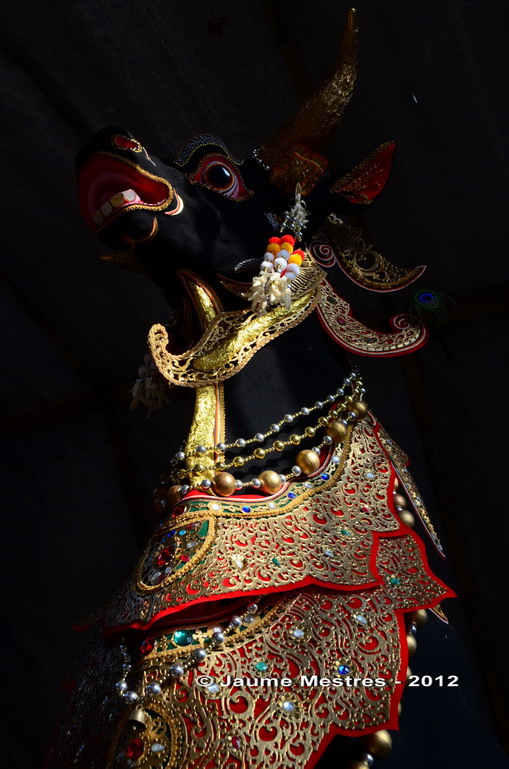 A la primera fotografia veiem una representació de titelles (wayang gedog) per entretenir l’ànima del mort abans no migri. Les imatges següents mostren assistents a la cerimònia, al moment de distreure’s amb l’actuació dels balls amb màscara o topeng (fotografia horitzontal). A les dues darreres imatges veiem el toro que s’incinerarà amb el cadàver a dins. El toro, damunt una base de fusta sostinguda per un entremat de troncs de bambú, és al portal de la casa.