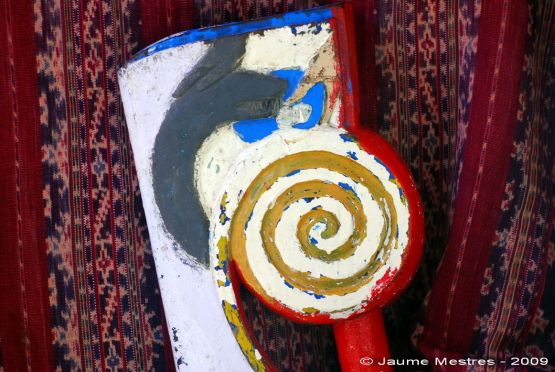 Mascaró de proa d’una embarcació o tena. Al fons, teixit tradicional -ikat- trenat al vilatge de Lamalera.