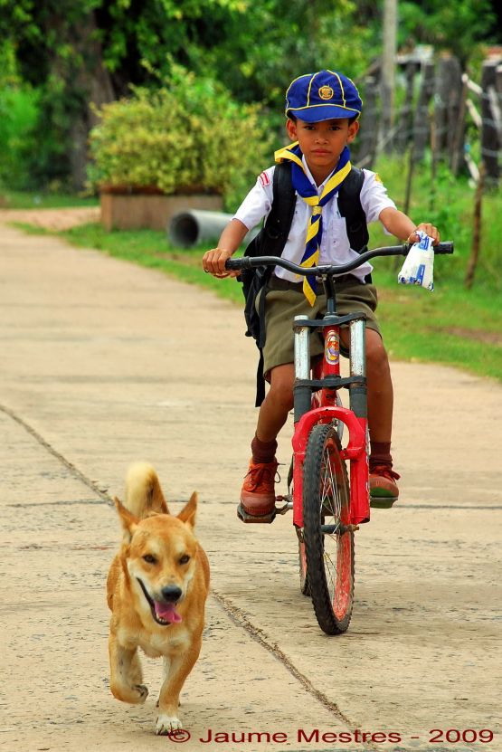 Sobre la una de la tarda aquest nen torna a casa després d’una jornada a l’escola. Al manillar de la bicicleta hi porta la bossa de llet que pertoca a cada criatura. Regal del govern, darrerament molt generós. Trens gratuïts i llet de franc pels escolars. Ban Prasat Yoë. Nord-est de Tailàndia.