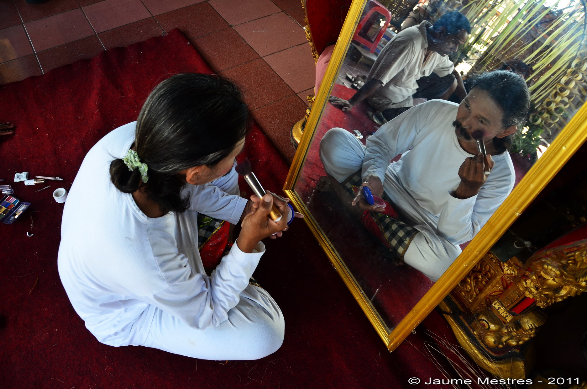 Padangtegal és un dels vilatges integrats a Ubud, al centre de Bali. Ahir a la tarda, dia 20 de juliol, va haver-hi una competició de dansa entre els quatre barris que formen Padangtegal. Durant les dues hores prèvies a la competició o lombah, els homes de Padangtegal Kaja (barri septentrional) es maquillen i es vesteixen en un dels porxos del bale banjar, l’espai comunitari del barri. La competició consistirà en la presentació de dues danses per barri. Una ballada per dones adultes i, l’altra, per homes també madurs. La dansa femenina serà l’anomenada Pendet. La que han de ballar els homes es diu Baris Gede (la dansa del guerrer). Un cop els ballarins s’han abillat, ens dirigim tots plegats al lloc on se celebra la competició, al banjar Mekarsari. Com que és relativament a prop ens hi desplacem a peu, passant per corralons minúsculs, o gang, com els anomenen a Bali. La porxada on se celebra la competició és pleníssima de gent del vilatge. Xalen de valent durant les representacions de les danses. Un parell de grups de ballarins del Baris Gede s’ho prenen molt en broma. Les gràcies del grup fan riure a cor que vols la concurrència. Els grups guanyadors no se sabran fins demà passat, el dia 23. Aposto que la competició de Baris Gede la guanyaran els de Padangtegal Kaja, els homes de les imatges.