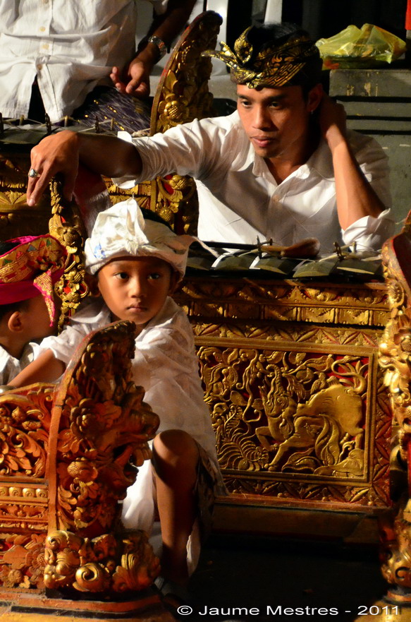 Les imatges ens obsequien amb l’actuació de gala d’una de les nombroses formacions femenines orquestrals de gamelan d’Ubud, població ubicada al cor de Bali. La interpretació de la peça que escoltem es desenvolupa en un dels bale o pavellons oberts als quatre vents dins el clos sagrat del temple Pura Dalem Agung, al bosc Alas Bojog (Monkey Forest), de Padang Tegal. Padang Tegal és un raval al sud d’Ubud. La interpretació s’inclou dins les magnes celebracions de l’aniversari del santuari, festes superbes que se celebren un cop cada vint anys. En produïr-se a l’interior del temple l’actuació té caràcter sagrat; els destinataris principals del concert són, doncs, els déus i esperits que regeixen l’ordre i la vida dels balinesos de la comunitat. En tot cas, el gaudi pels humans -que també hi és- passa a segon terme. Abans que res complaure amb la música l’oïda dels éssers superiors per satisfer-los. A major satisfacció més pròdigs seran els déus a l’hora de vessar benediccions i beneficis als mortals que els honoren i veneren.