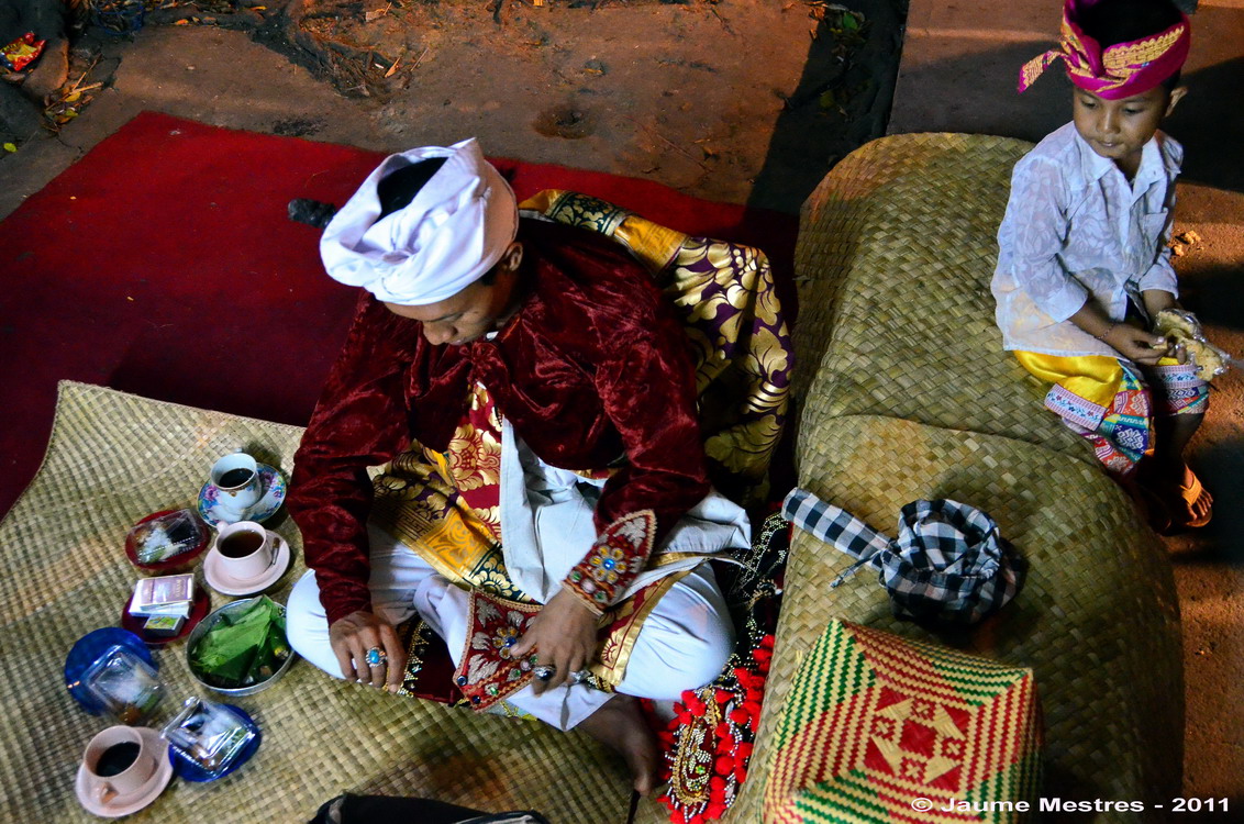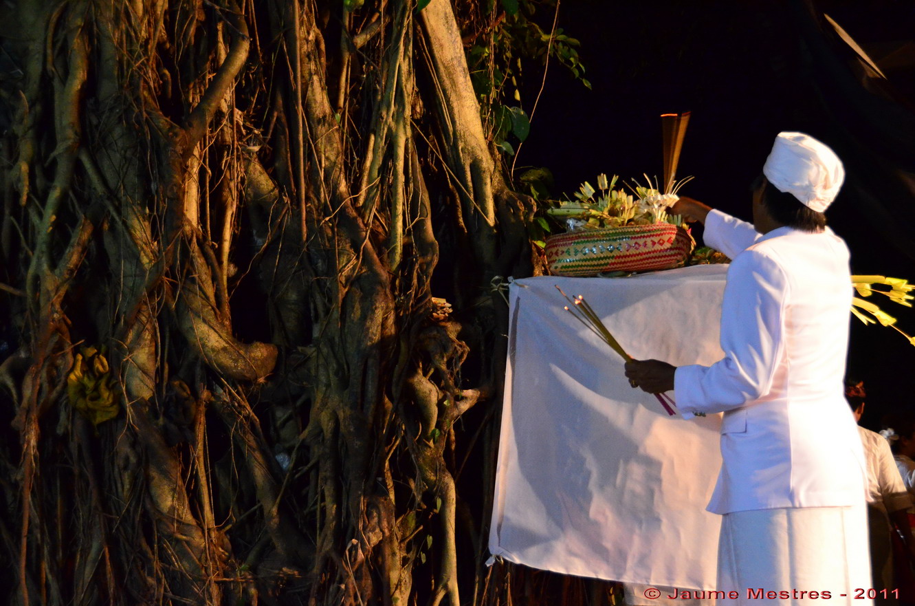 Cada 210 dies els balinesos celebren una cerimònia o odalan en un dels temples del seu barri o població. Són cerimònies festives que serveixen per donar gràcies, demanar sort i proteció als déus i esperits que els governen. Abans d’ahir i ahir al vespre (27 i 28 de juliol, respectivament) vaig participar de les cerimònies que van celebrar-se al temple Pura Keloncing, al nord del vilatge Padangtegal, al municipi d’Ubud. Vaig compartir sopar, dolços, tes i cafè amb la comunitat del vilatge. També vaig participar de les pregàries col·lectives al clos més sagrat del santuari, davant les torres on seuen els déus custodiats per soldats de pedra. Envoltat de fidels, ombrel·les, torres d’ofrenes amb fruita i animals empalats. Després, vaig escoltar l’orquestra de gamelan i fruir de les danses. Les fotografies són testimoni del record d’aquests dos darrers dies.