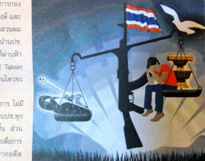 La imatge expressa el sentiment generalitzat al país després dels traumàtics fets esdevinguts a Bangkok el passat mes de maig. Exceptuant incidents puntuals, com ara esporàdiques explosions de petites bombes a Bangkok, la situació està sota el control de l’exèrcit i el govern. Però el problema de fons no està resolt. Imatge publicada a la revista quinzenal tailandesa Red Power. La supervivència d’aquesta revista, com algunes altres del mateix signe polític, està seriosament amenaçada. El passat 9 de setembre, l’editor de Red Power va haver de suspendre la seva participació en un simposi sobre el futur dels media tailandesos, a Lad Phrao -nord de Bangkok-, avisat que policies de paisà s’hi presentarien amb la missió de detenir-lo.